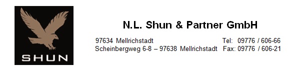 ![]() E-Mail an: info@shun.de Internet: http://www.shun.de Sitz: Mellrichstadt Registergericht: Amtsgericht Schweinfurt, HRB 2749 Geschäftsführer: Peter Hofmann, Detlef Reuss, Dipl.-Kfm.(Univ.) Ulrich Schmitt Umsatzsteuer-ID: DE 143 455 268 (gemäss § 27a Umsatzsteuergesetz) Haftungshinweis: Trotz sorgfältiger inhaltlicher Kontrolle übernehmen wir keine Haftung für die Inhalte externer Links. Für den Inhalt der verlinkten Seiten sind ausschließlich deren Betreiber verantwortlich. |